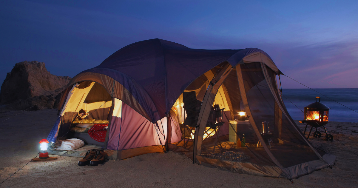 テントは初心者向けの「ドーム型」が設営しやすくおすすめです。耐水圧やサイズを確認し、使用人数+1人分の余裕を持つと快適に過ごせます。